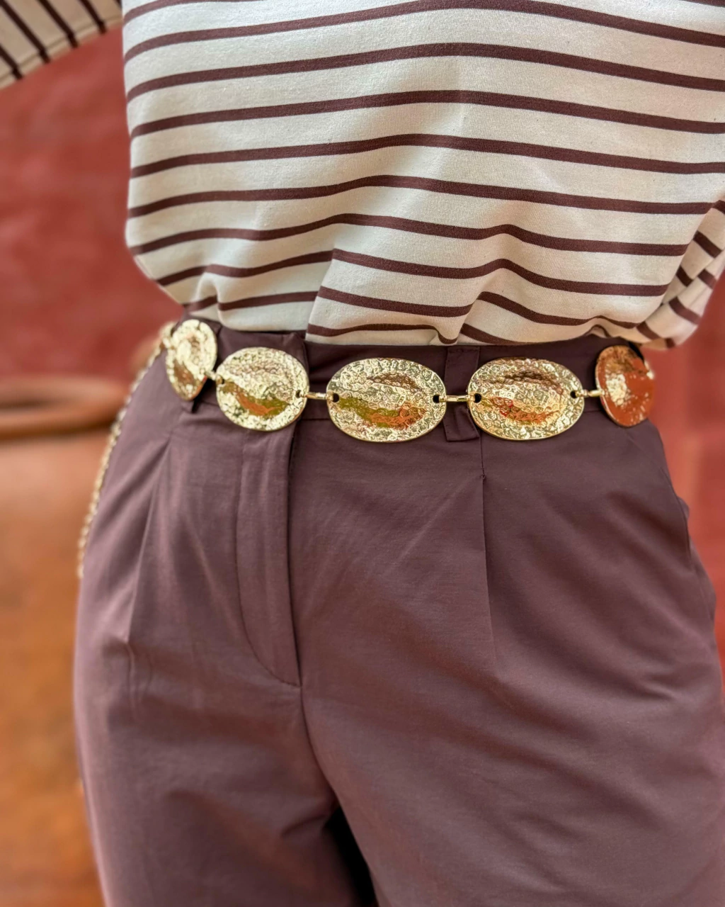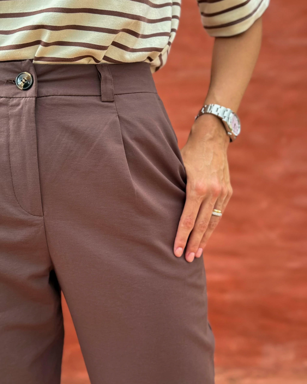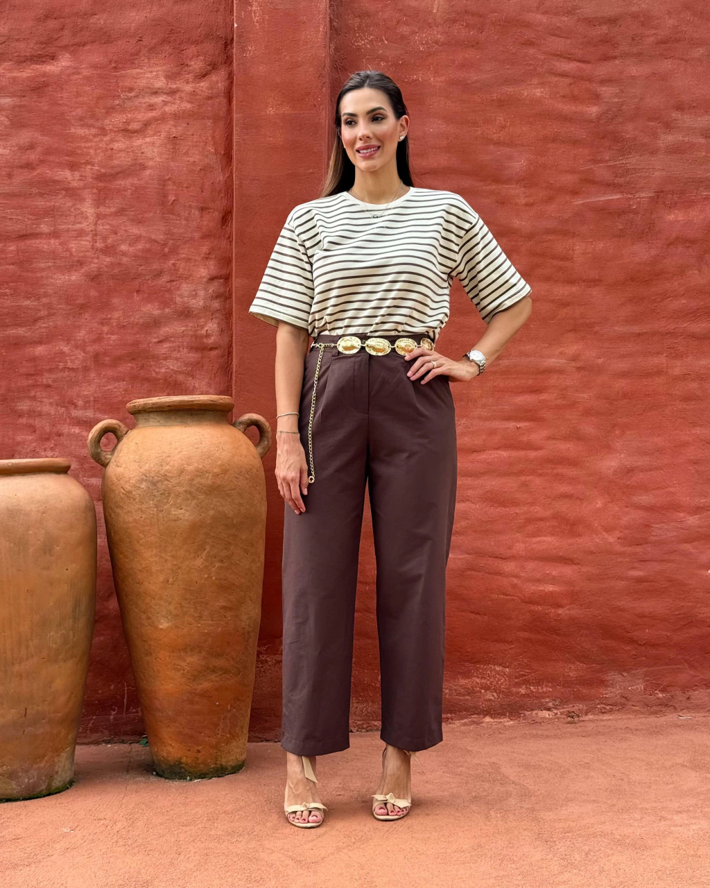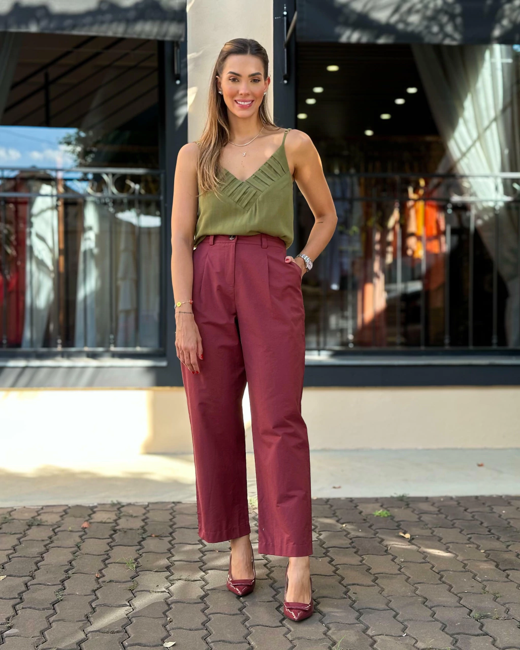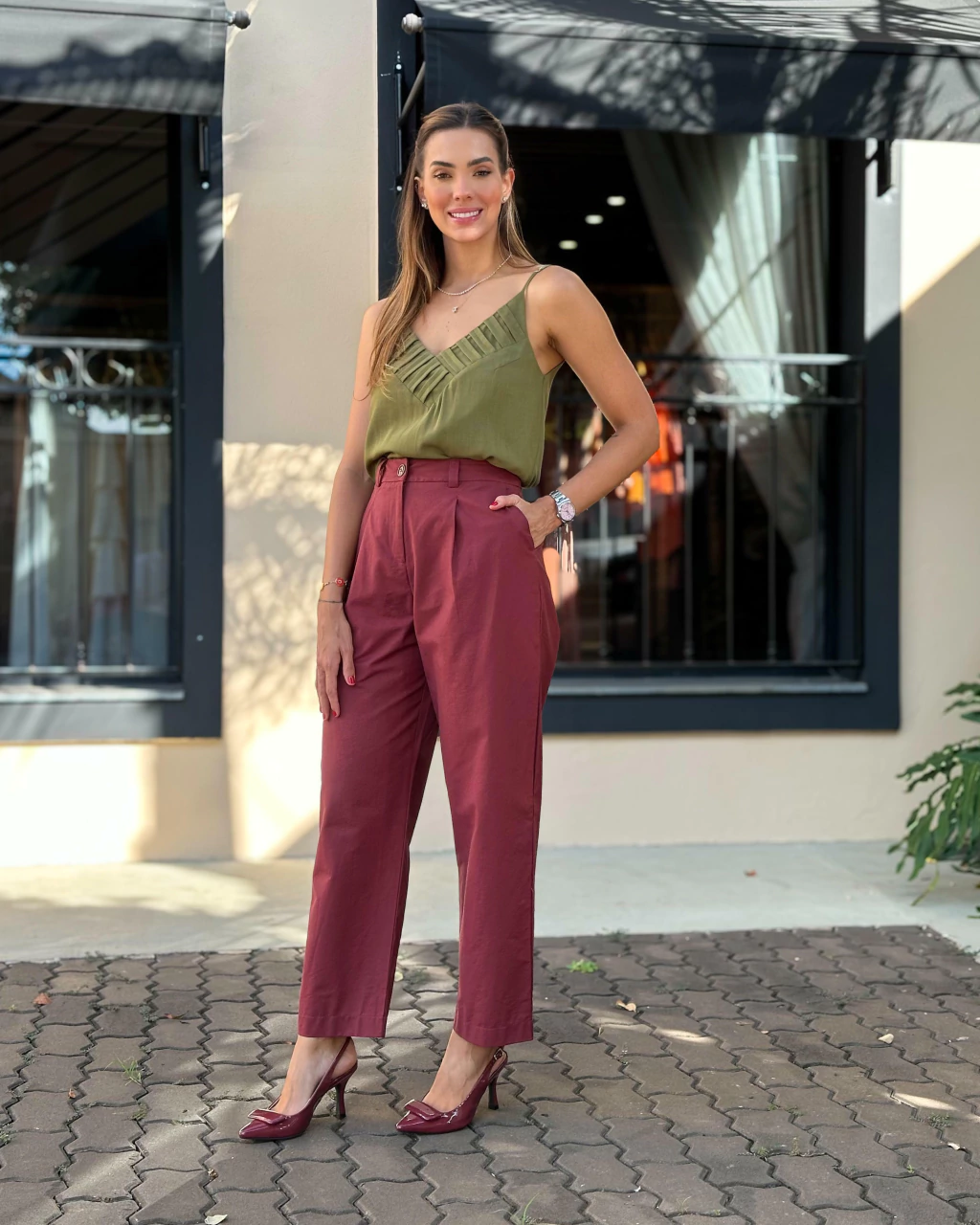 Calça modelagem reta, confecionado em triciline, cós com passantes, bolso faca nas laterais, bolso alfaiataria não funcionais costas com botões e azelha.