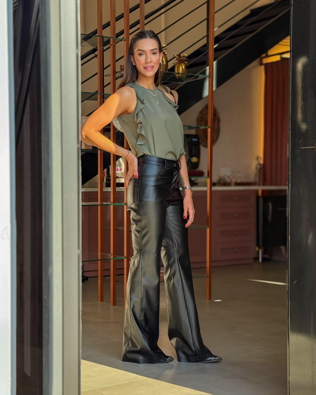 Calça cigarrete com forro curto, possui detalhe de zíper de metal e bolsos chapados na frente.
