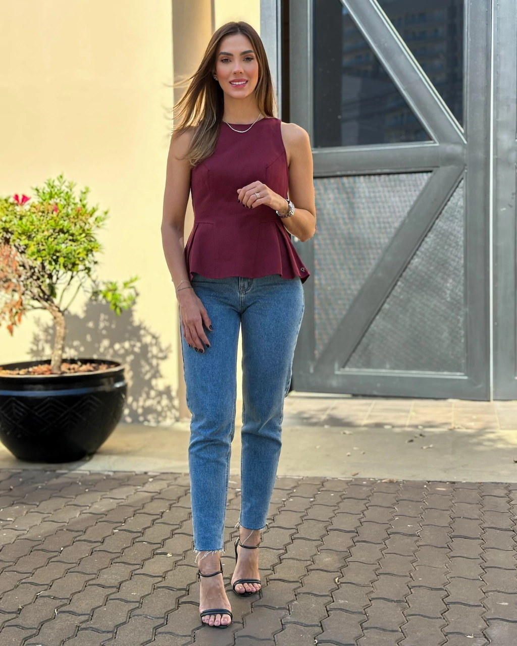 Calça Jeans em Algodão. Modelo tradicional, reta, cós alto, passantes, bolsos, barra a fio e fechamento em zíper com botão.