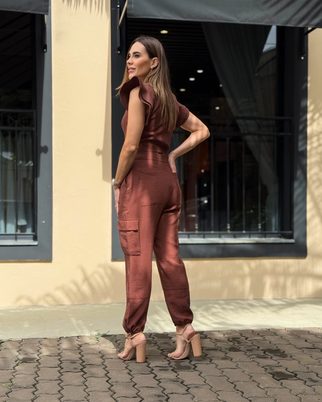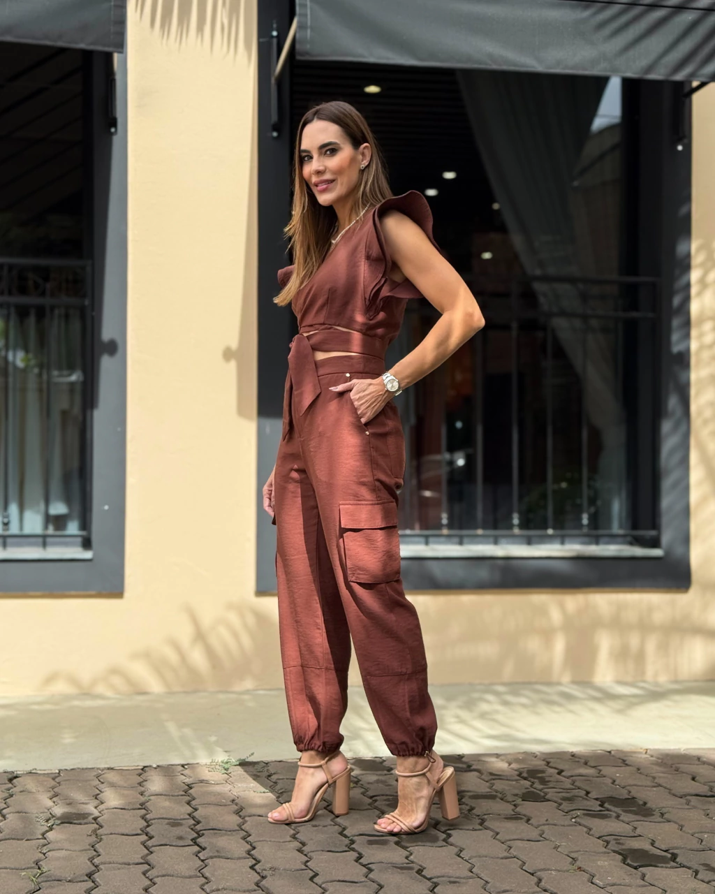 Calça. Modelo jogger, bolsos faca , bolsos sobrepostos fole laterais com lapelas , prespontos rentes, regulagem na barra. fechamento em zíper com botão transparente interno e botão de pressão forrado externo.