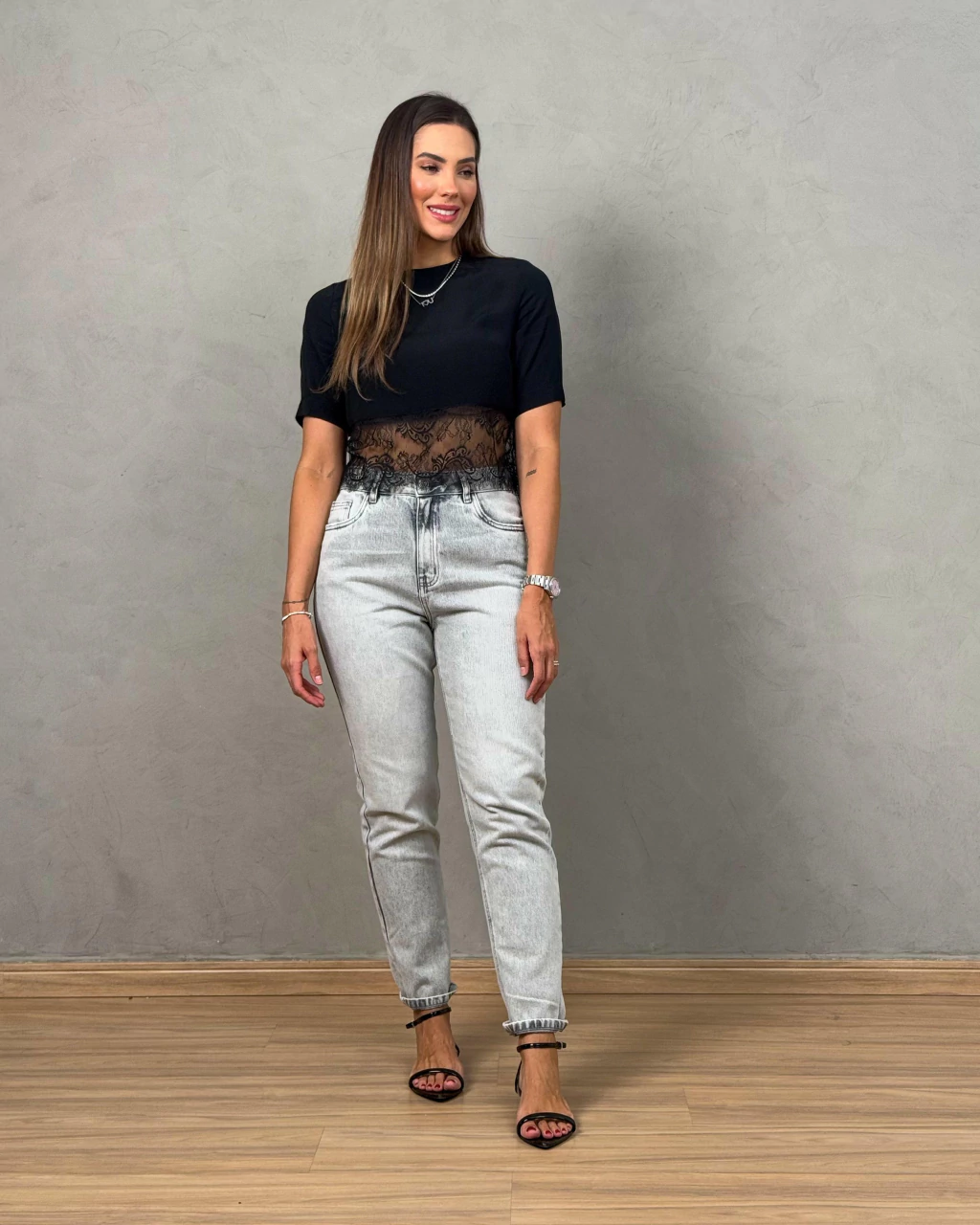 Calca. Modelo reta com barra feita, bolsos e fechamento com zíper e botão.