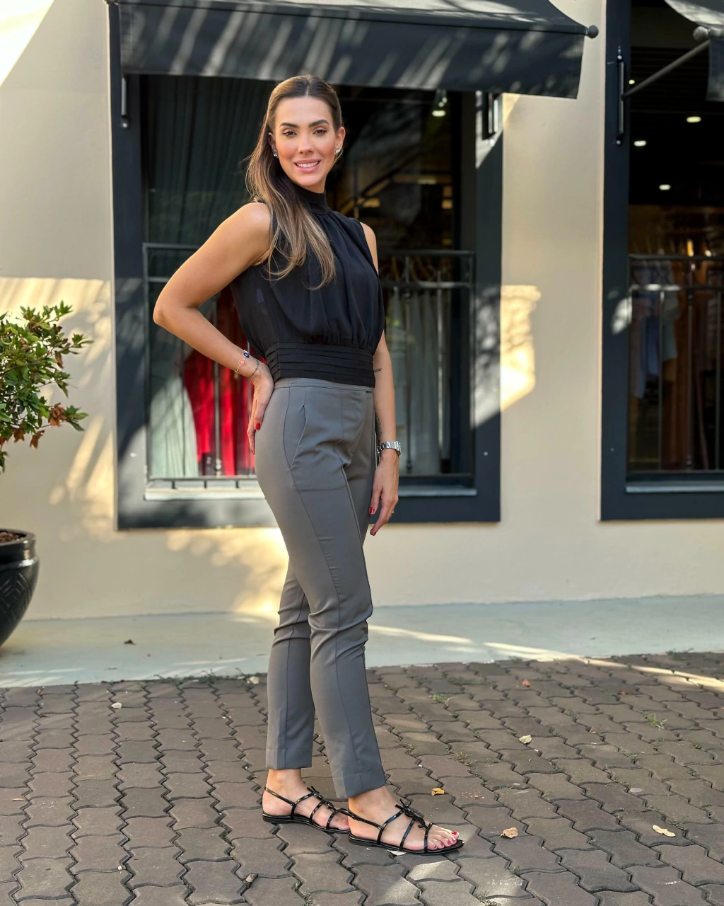 Calça. Modelo reto de alfaiataria com cós transpassado, bolsos e fechamento de botão e zíper.