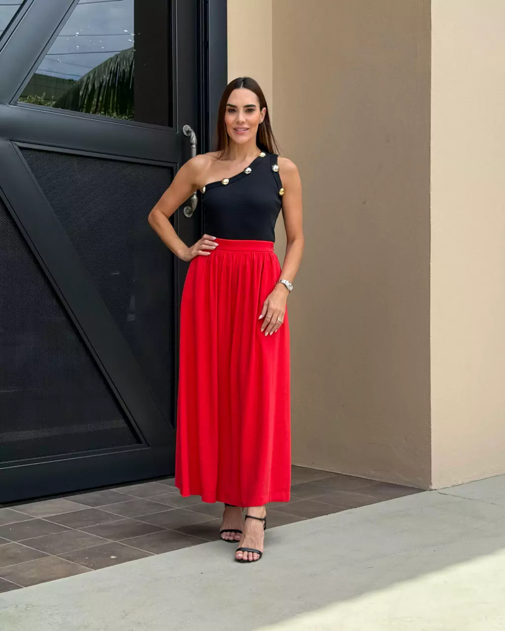 Confeccionada em tecido encorpado e detalhes de tachas,ela se ajusta ao corpo como uma luva, garantindo conforto e um toque de ousadia. A modelagem é perfeita para quem gosta de se destacar na multidão, e o detalhe de um ombro só? É puro glamour!