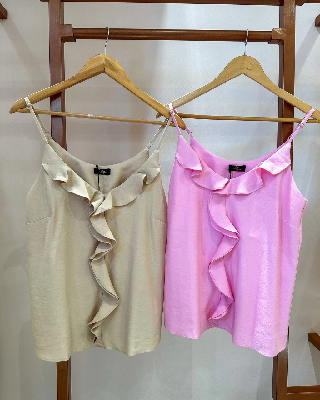 Regata de alça com jabots, contém regulagem na alça.