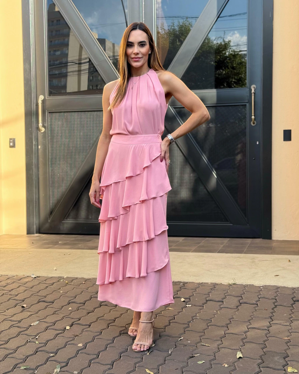 Saia.Modelo midi de tecido leve e fluido com camadas de babados diagonais e fechamento po zíper lateral.