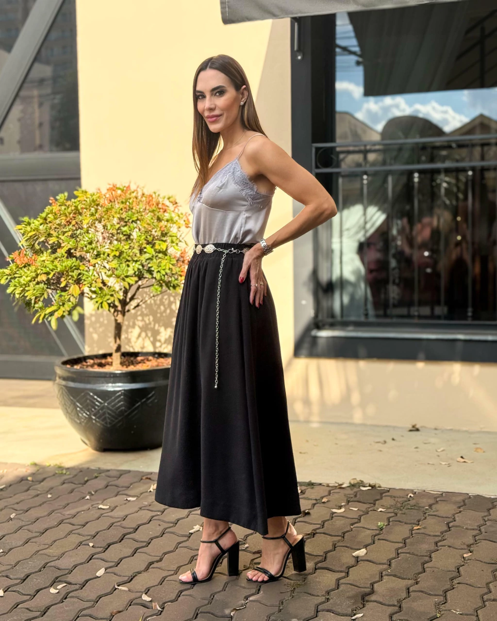Saia em corte godê. Modelo midi com elástico na cintura, com bolsos laterais. Para um look estiloso e confotável aposte em tênis e rasteiras.