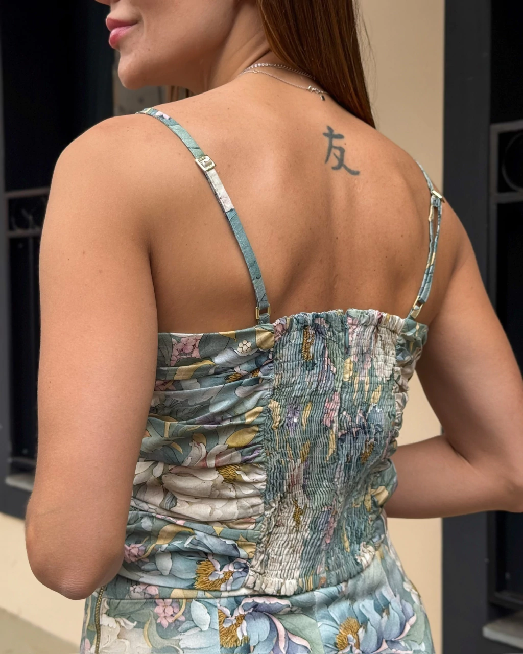 Top Estampa. Modelo em tricoline, cropped, alças finas com regulagem, drapeado em toda peça, lastex e fechamento em zíper costas.