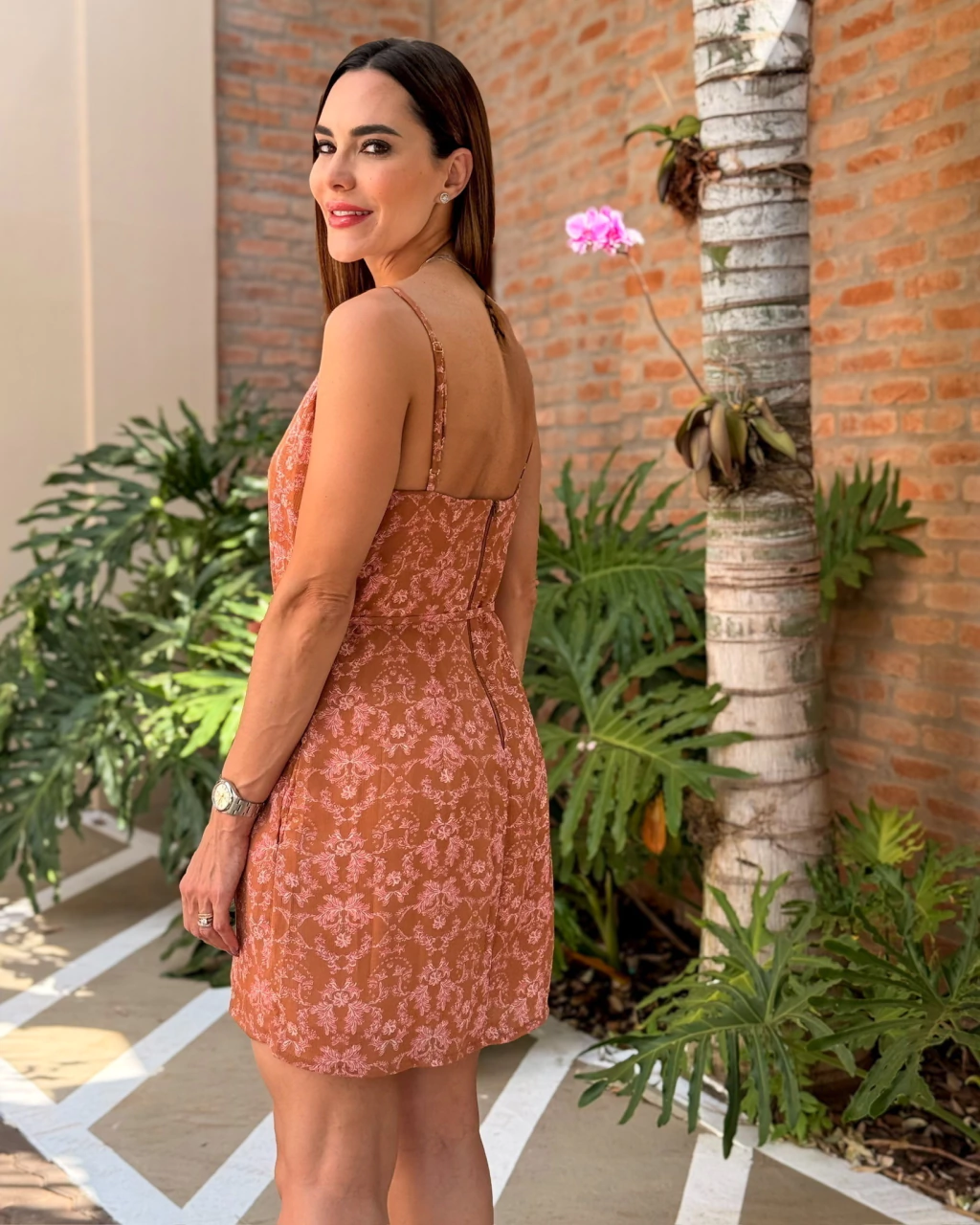 Vestido. Modelo com estamapa floral,curto com alça final ajustavel, decote ´V´e acompanha cordão para acenturar.