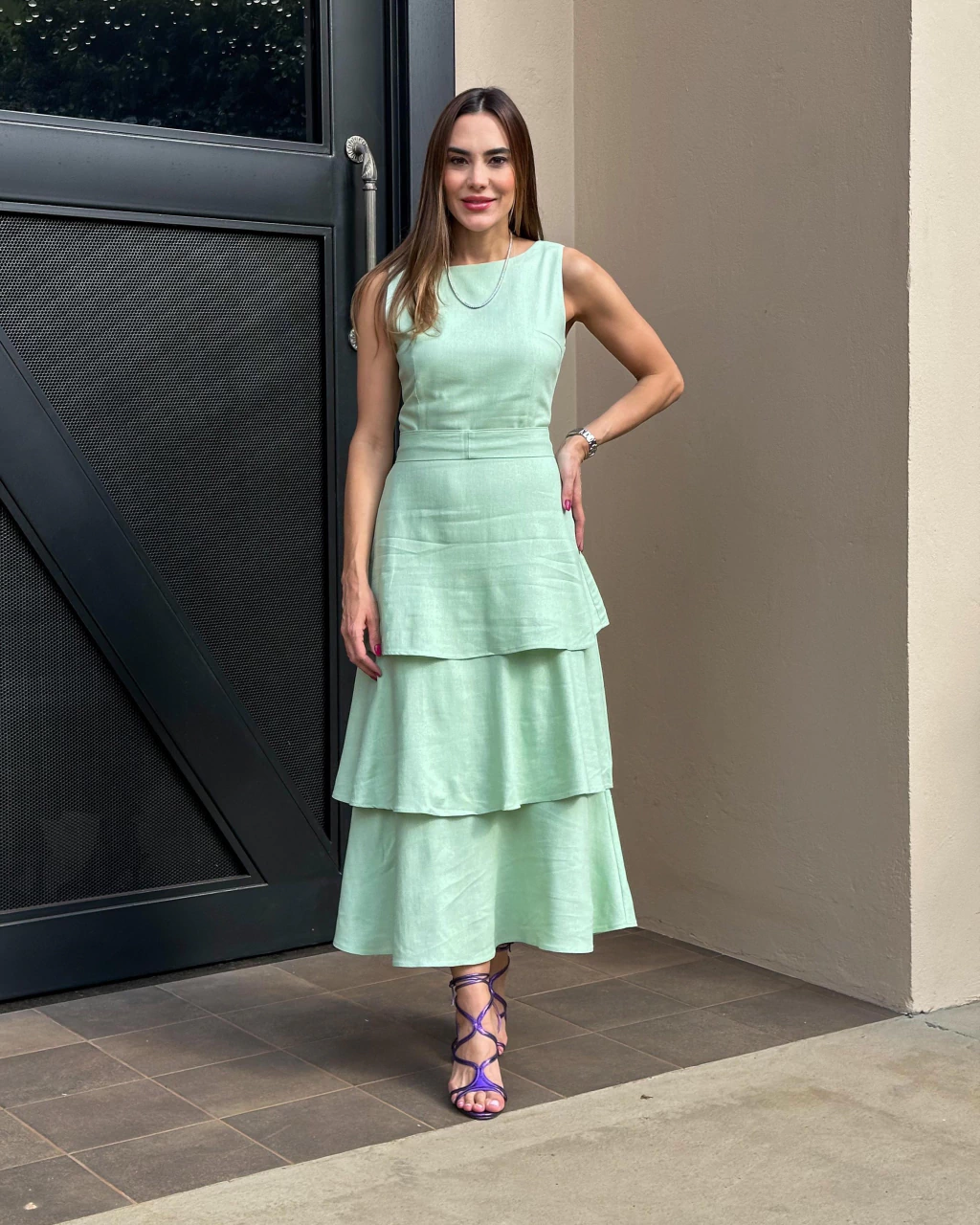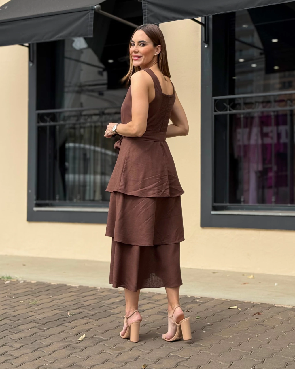 Vestido Massiê. Modelo midi com babados em linho e fechamento com zíper nas costas.