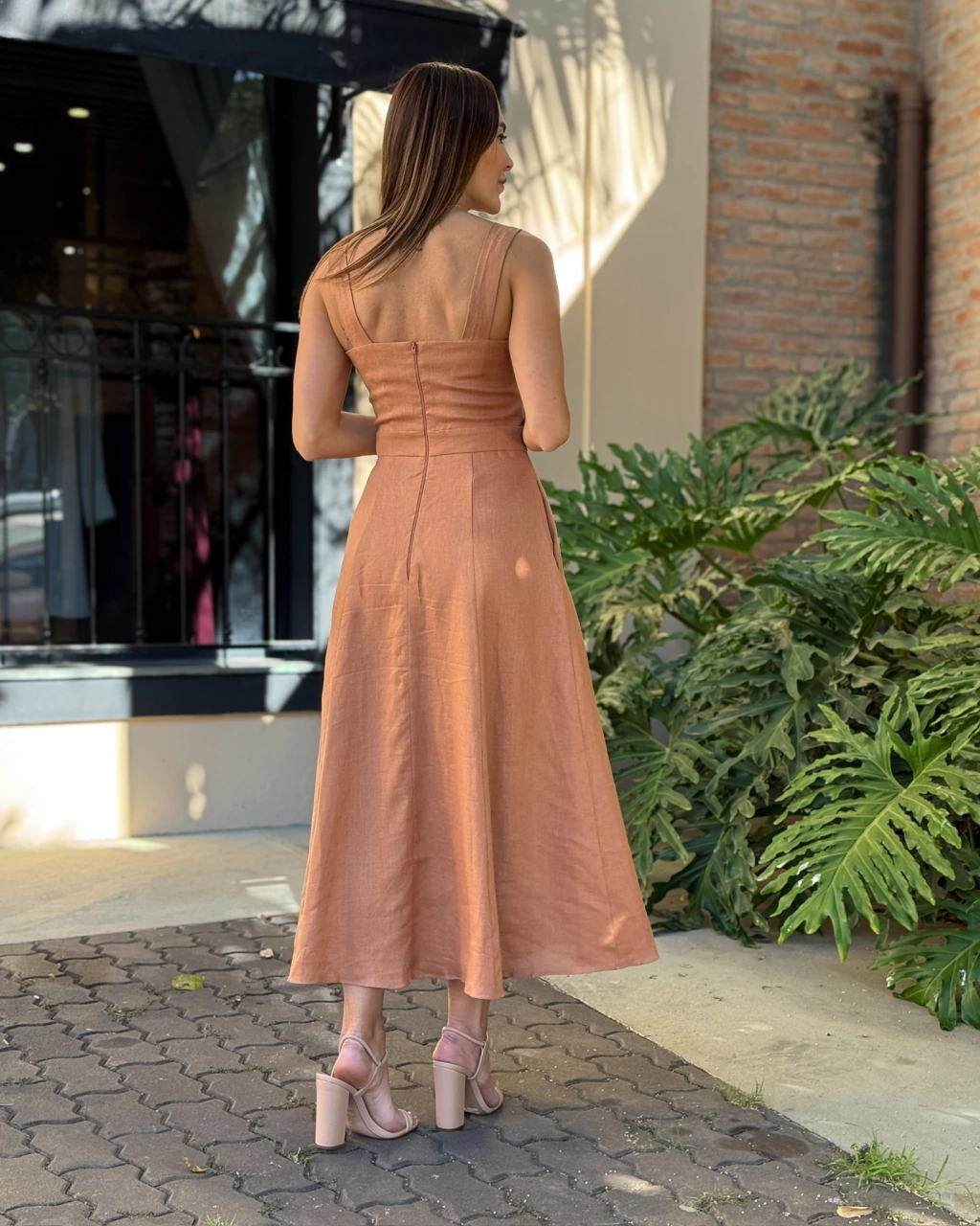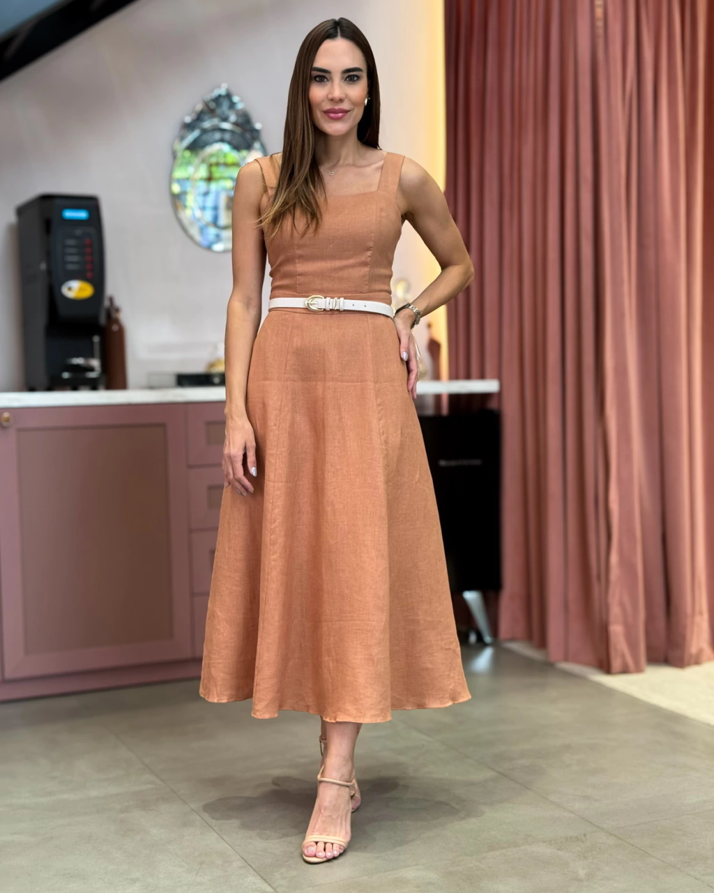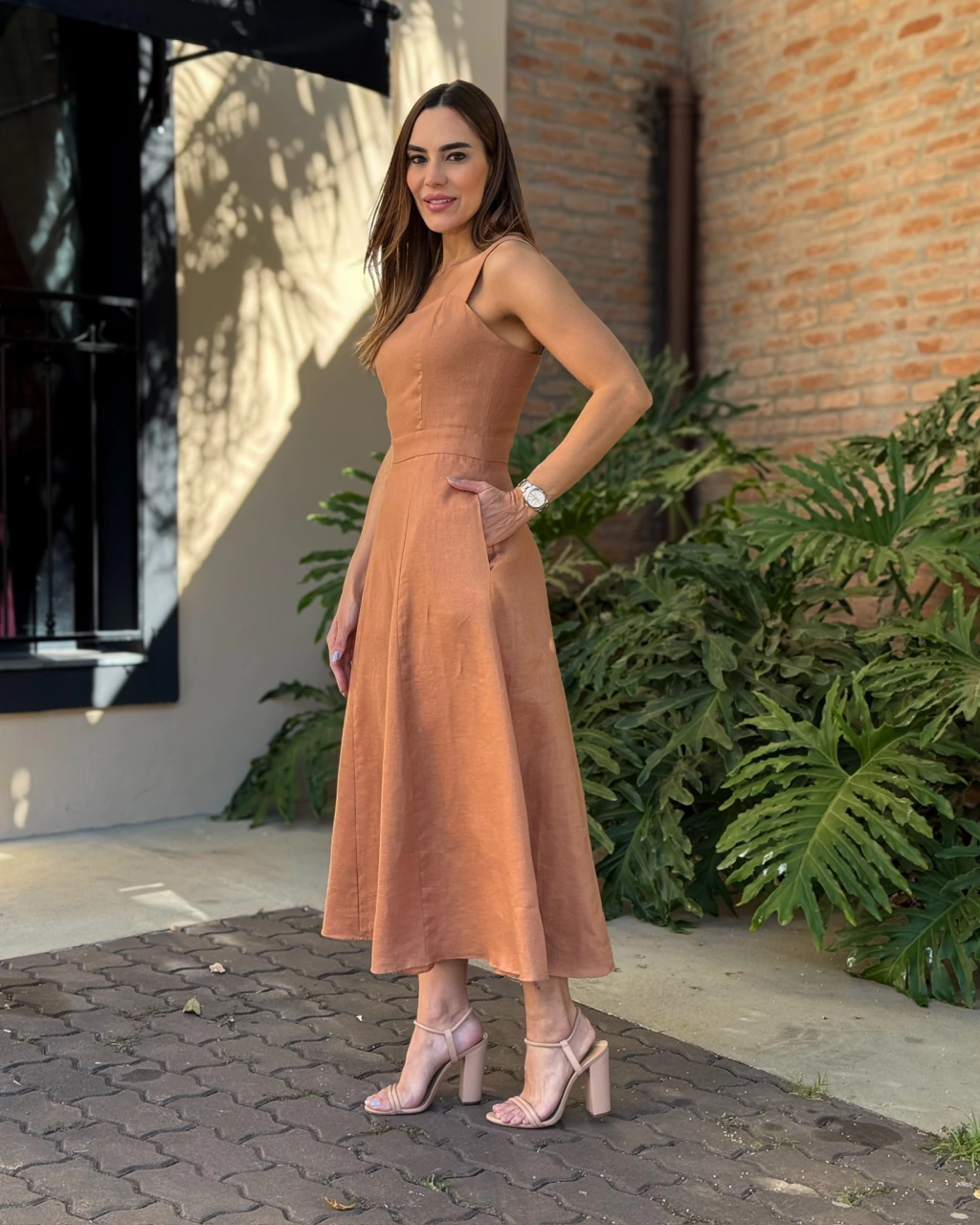 Vestido midi evasê em linho alça larga, decote reto e bolsos.