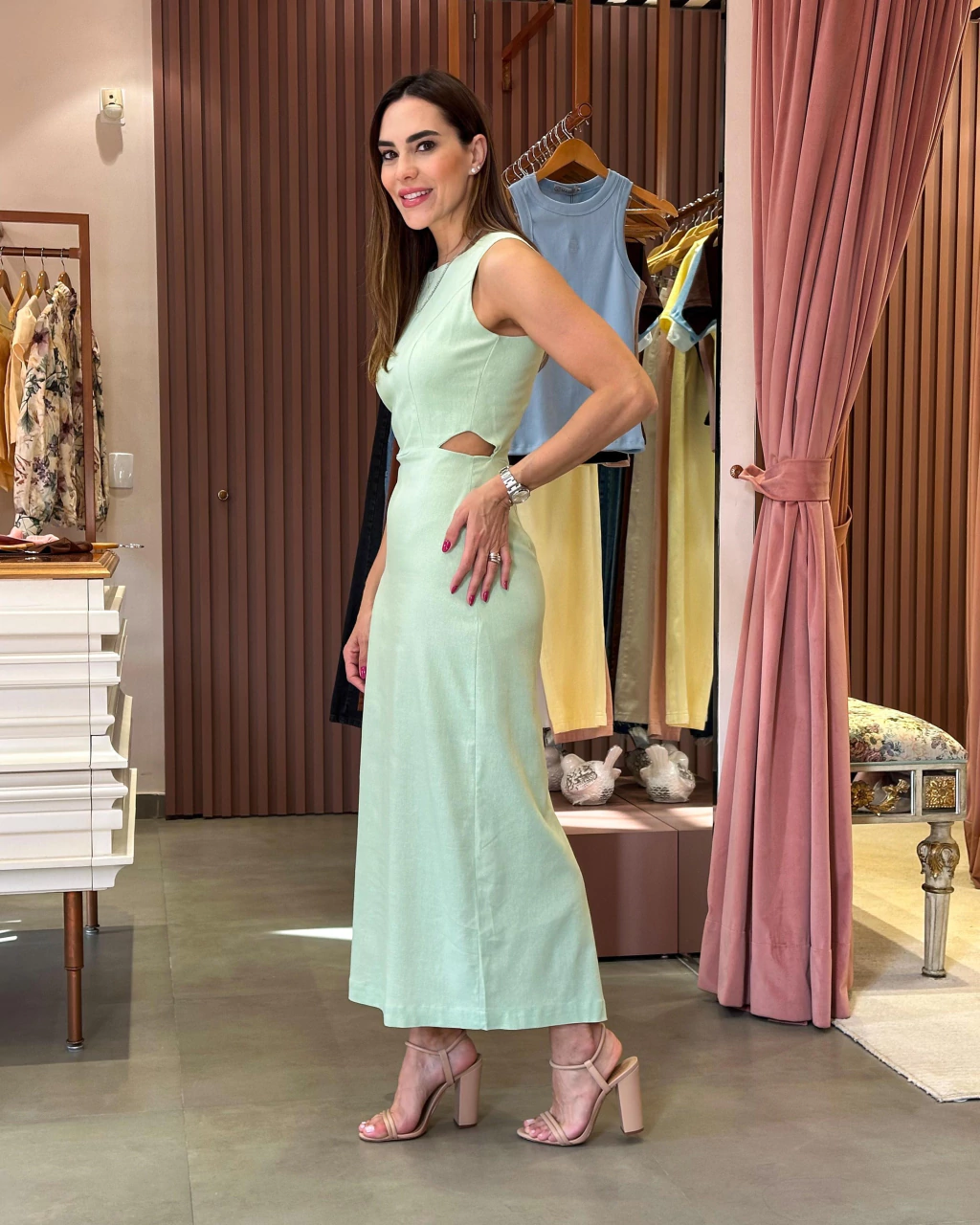 Vestido.Modelo midi com detalhe de abertura na lateral e fenda nas costas.
