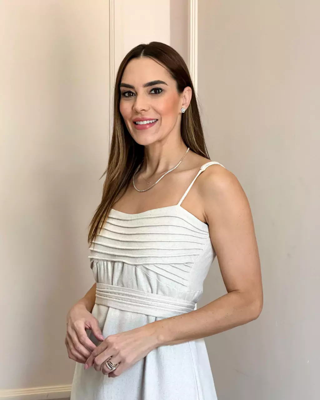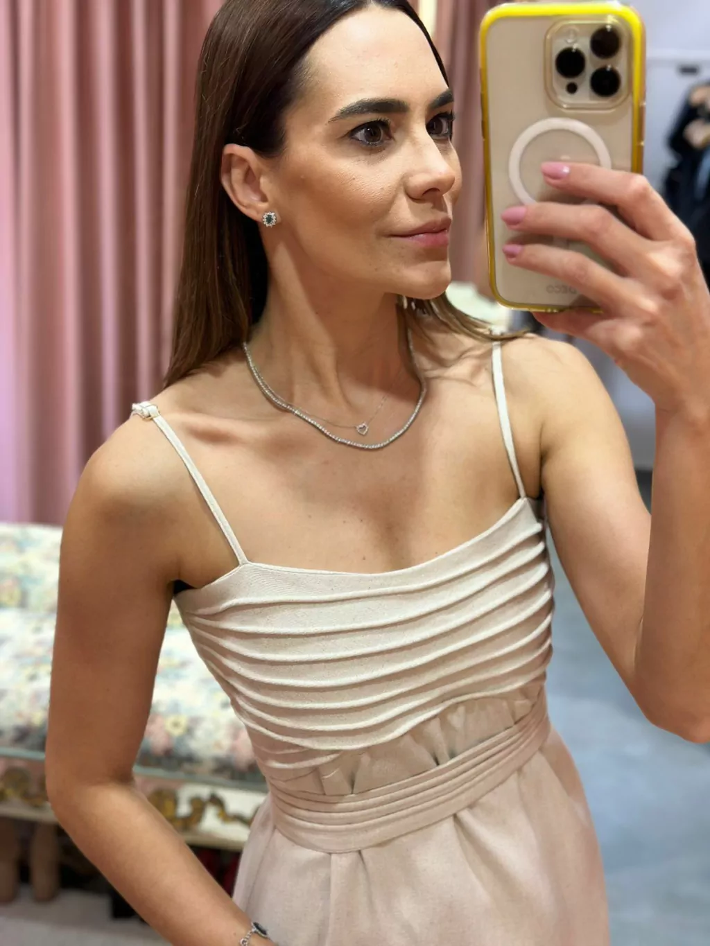 Possui forro e detalhes drapeados horixontais, que adicionam textura e sofisticação a peça.