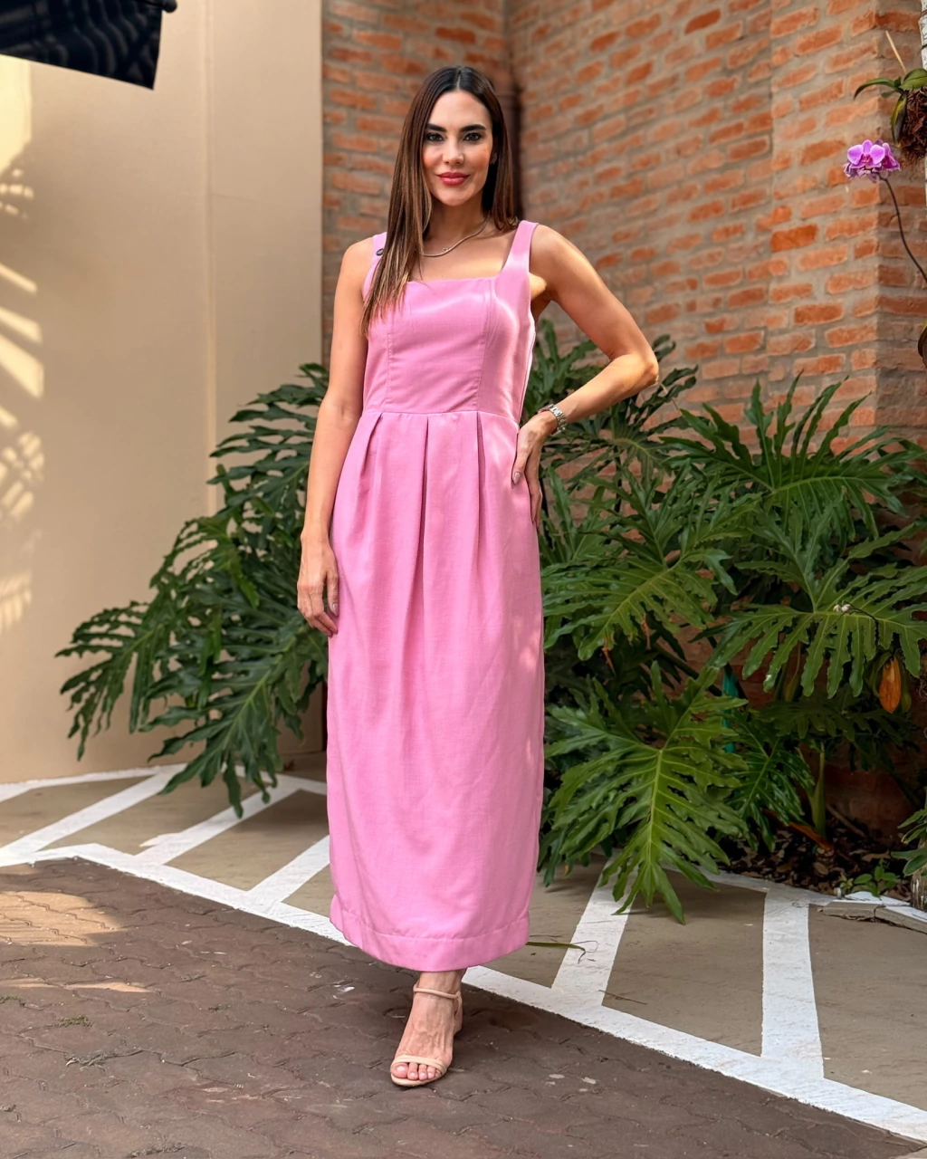 Vestido. Modelo midi com forro,decote reto,bolsos,pregas, fechamento com zíper nas costas e fenda.