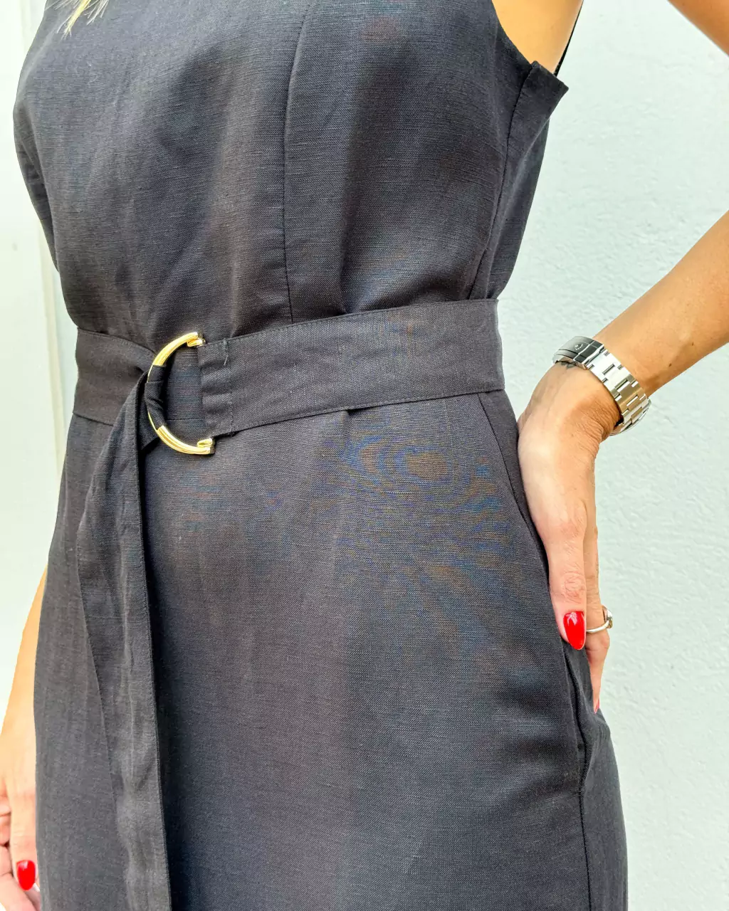 Vestido midi linen fresh.Modelo reto, alça largas, decote quadrado,com cinto,bolsos,detalhes de botões e fenda nas costas.