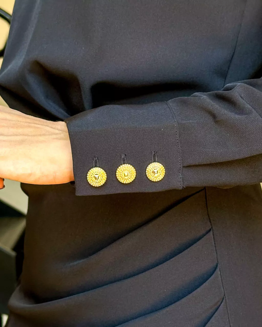 Vestido curto com pregas, ombreiras fechamento em botão e zíper.