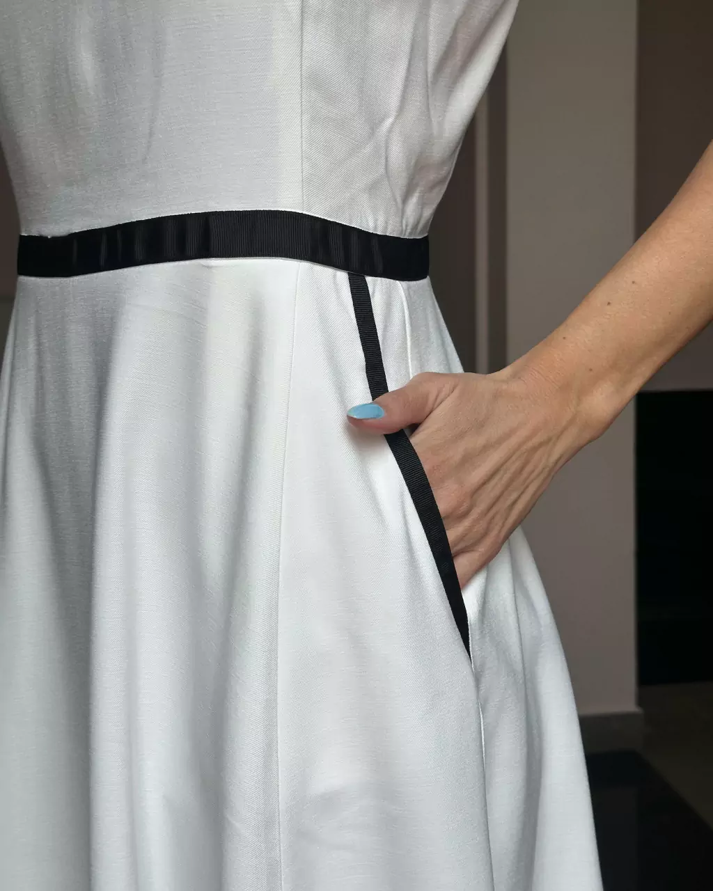 Vestido Twill.Modelo midi em alfaiataria com bolsos, forro, fechamento com zíper nas costas e detalhe bicolor.